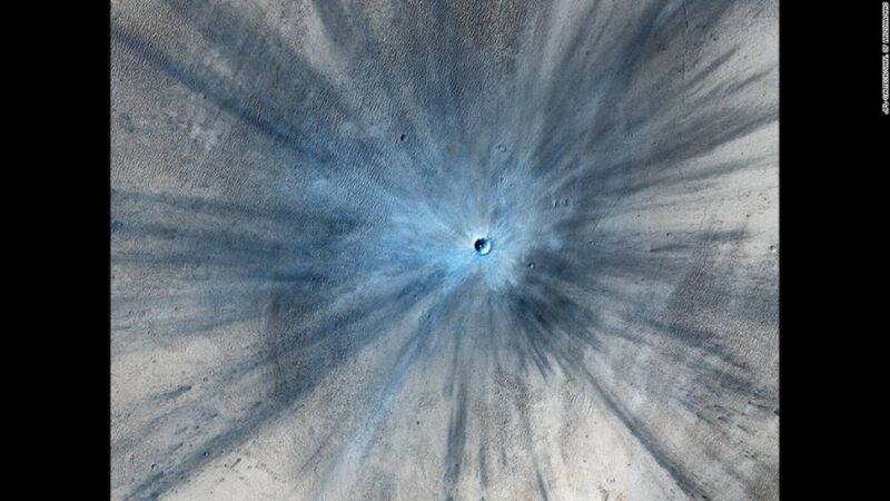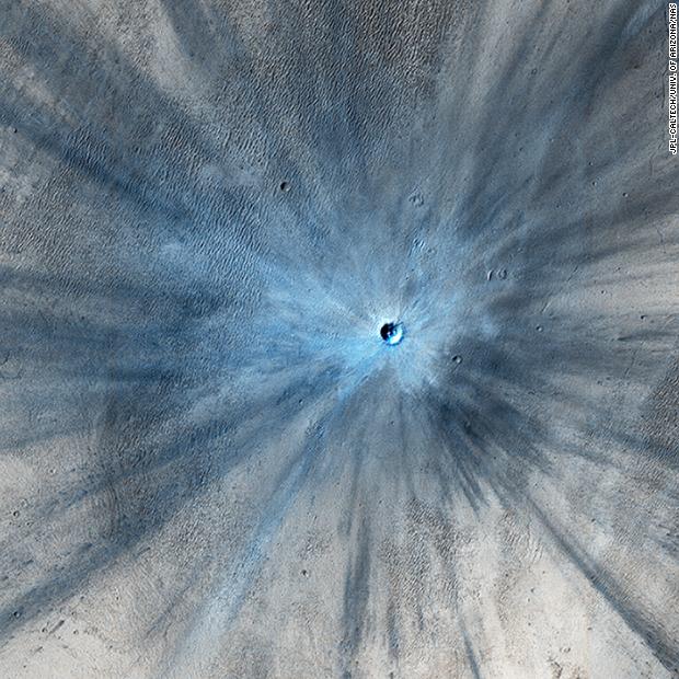 Photos: The best moments on MarsA dramatic, fresh impact crater dominates this image taken by the HiRISE camera on November 19, 2013. The crater spans approximately 100 feet and is surrounded by a large, rayed blast zone. Because the terrain where the crater formed is dusty, the fresh crater appears blue in the enhanced color of the image, due to removal of the reddish dust in that area.Hide Caption 27 of 30