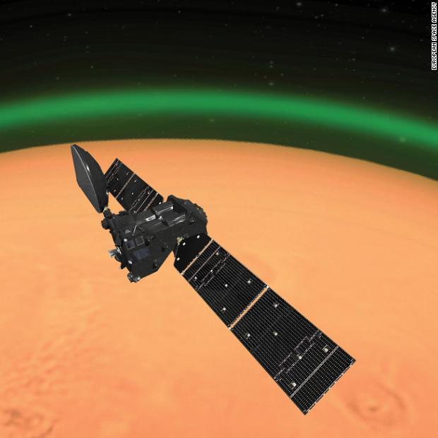 Photos: The best moments on MarsThis artist’s illustration shows the ExoMars Trace Gas Orbiter as it orbits Mars. The orbiter detected a layer of glowing green oxygen in Mars’ atmosphere. Hide Caption 1 of 30