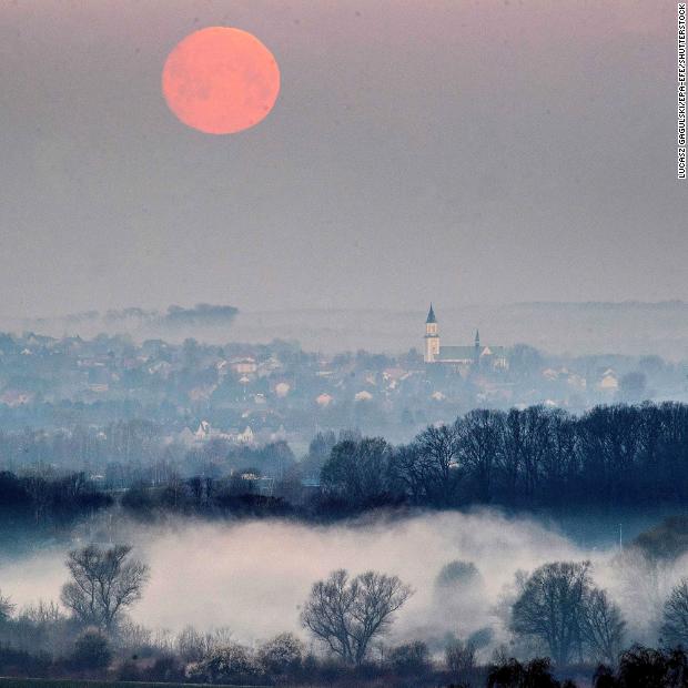 Photos: The April pink supermoon in picturesThe moon takes on a reddish hue as it reflects the light of early dawn in Krakow, southern Poland.Hide Caption 8 of 11