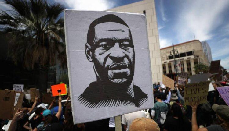A protester holds a sign with an image of George Floyd during a peaceful demonstration over George Floyd’s death outside LAPD headquarters on June 2, 2020 in Los Angeles.