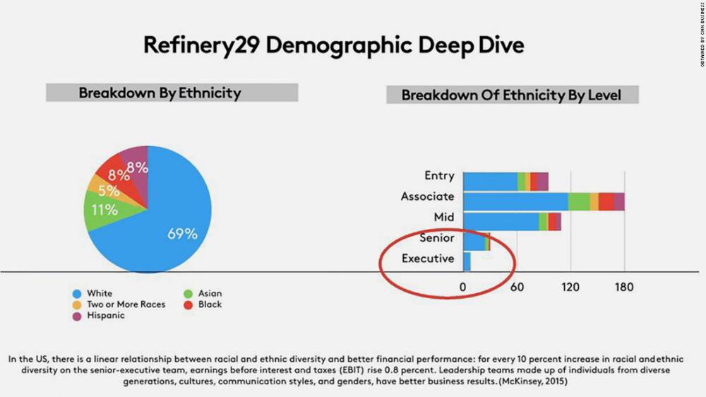 Instead it inspired a revolt. In the ensuing days, a number of former employees came forward on Twitter to call out what they saw as hypocrisy on the part of the website’s leadership, especially when it came to matters of race and diversity. The site’s co-founder and editor-in-chief, Christene Barberich, had repeatedly confused one black woman with another, one said; another tweeted that an executive once confused her with the caterer; a third person said she was paid $15,000 less than her two white coworkers who were doing the same job. And within less than a week, Barberich was out of her job, saying on Monday she was stepping down “to help diversify our leadership in editorial.” Ashley C. Ford, the former employee who said Barberich used to confuse her for another black woman, was one of the most prominent people who spoke out, saying in one tweet that she’d left Refinery29 after nine months because of a “toxic company culture where white women’s egos ruled.” She was moved to tweet, she told CNN Business afterward, by seeing a thread from another former employee, Ashley Alese Edwards. “[W]hen I started reading that thread and started seeing some of the responses to it, the big thing that hit me was, ‘Oh, you idiot. Leaving didn’t make anything stop. … You left and they kept doing this. They kept treating women like this. They kept treating black women like this,'” she said. Read MoreFord and Edwards were not the only ones who spoke out, or the only ones with disturbing stories to tell. Some sources who spoke to CNN Business said there was a glaring lack of diversity at the company. Some said that despite the inclusive image that the site tried to present, Barberich made a number of editorial decisions that had the effect of diminishing minority and especially black women.