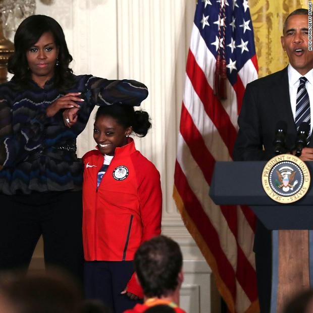 Photos: Superstar gymnast Simone BilesFirst lady Michelle Obama rests her elbow on Biles’ head as President Barack Obama speaks during an Olympic athletes event at the White House in September 2016.Hide Caption 14 of 27