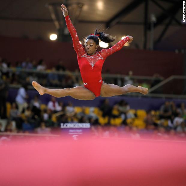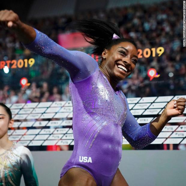Photos: Superstar gymnast Simone BilesSimone Biles competes in the floor exercise during the World Championships in Stuttgart, Germany, in October 2019.Hide Caption 1 of 27
