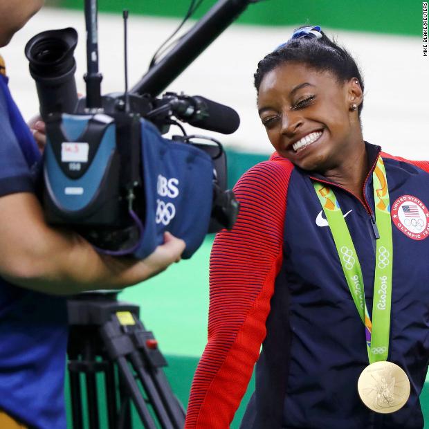 Photos: Superstar gymnast Simone BilesBiles reacts to a camera after winning the individual all-around final at the 2016 Olympics.Hide Caption 8 of 27