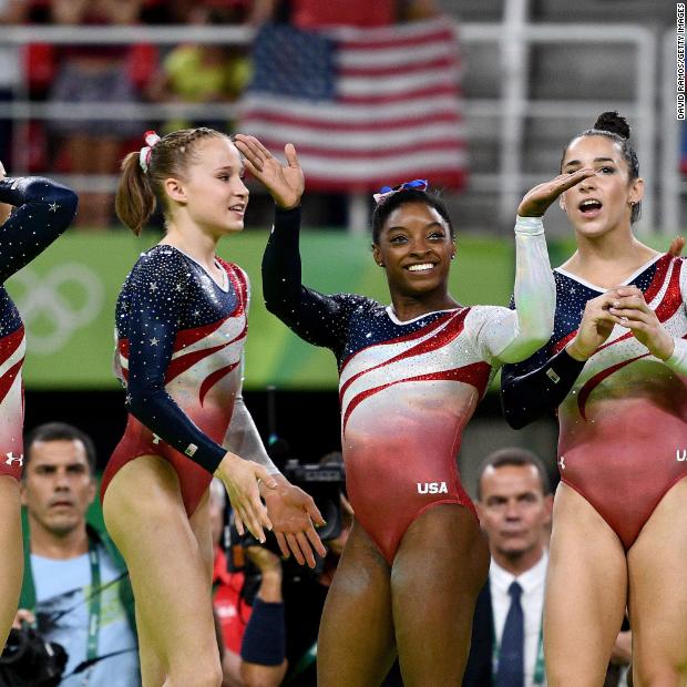 Photos: Superstar gymnast Simone BilesFrom left, Laurie Hernandez, Madison Kocian, Biles, Aly Raisman and Gabby Douglas celebrate winning the gold medal during the team final of the 2016 Olympics.Hide Caption 6 of 27