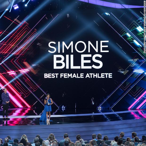 Photos: Superstar gymnast Simone BilesBiles speaks after receiving the ESPY Award for best female athlete in 2017.Hide Caption 18 of 27