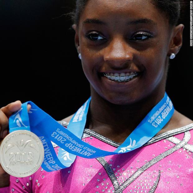 Photos: Superstar gymnast Simone BilesBiles dodges a bee flying near her during the medal ceremony after winning gold in the all-around final of the 2014 World Championships.Hide Caption 3 of 27