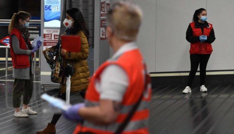 Spanish workers wear masks leaving the subway on April 13, in Madrid.