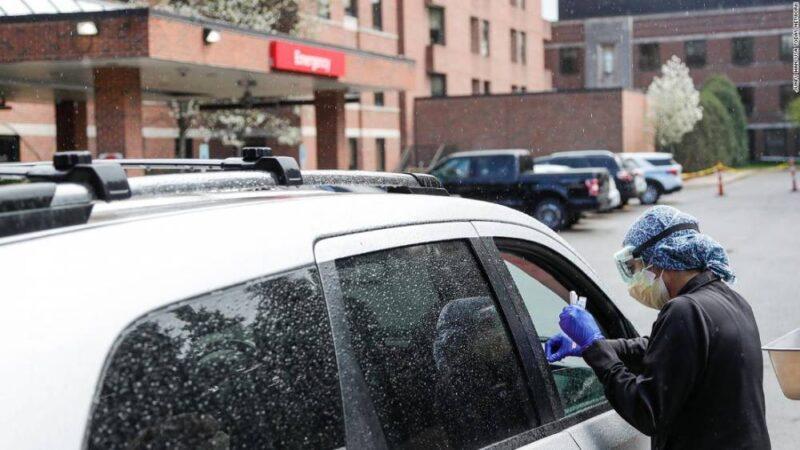 An ER technician tests patients for Covid-19 outside of the emergency entrance of Beaumont Hospital in Grosse Pointe, Michigan, on April 15, 2021