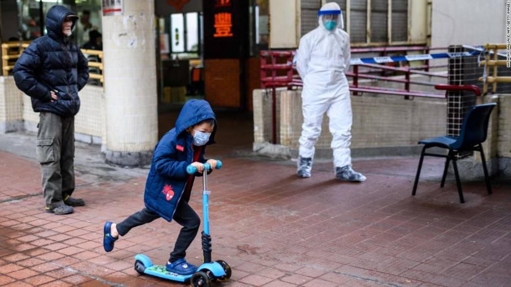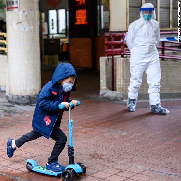 Photos: The novel coronavirus outbreak A child rides a scooter past a police officer wearing protective gear outside the Hong Mei House in Hong Kong on February 11. More than 100 people evacuated the housing block after four residents in two different apartments tested positive for the coronavirus.Hide Caption 78 of 140