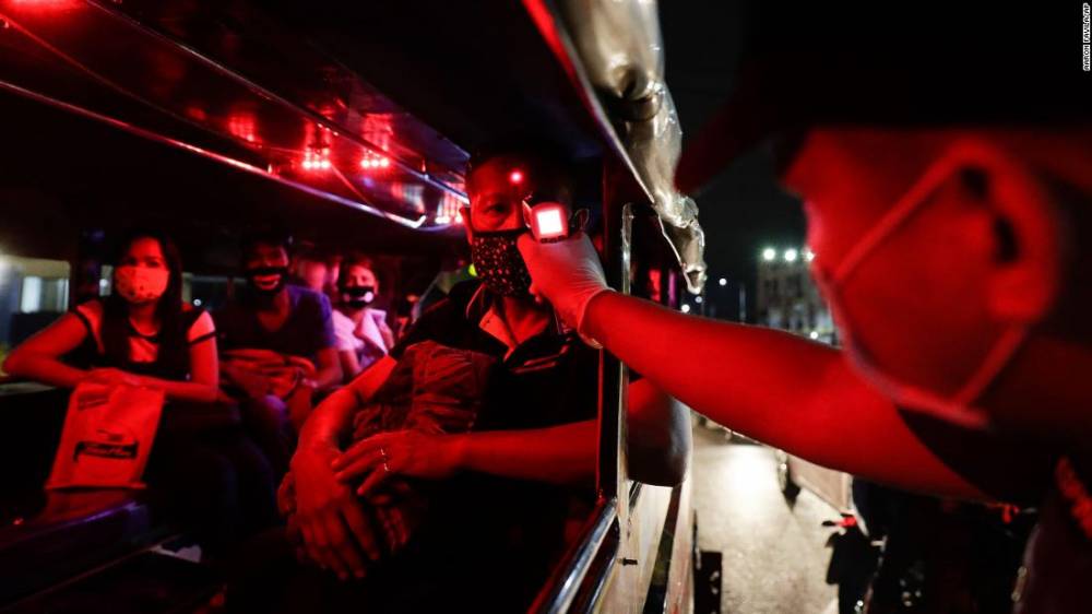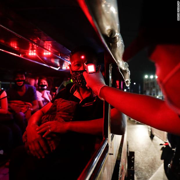 Photos: The novel coronavirus outbreak A police officer checks the temperatures of bus passengers at a checkpoint in Manila, Philippines, on March 16.Hide Caption 12 of 140