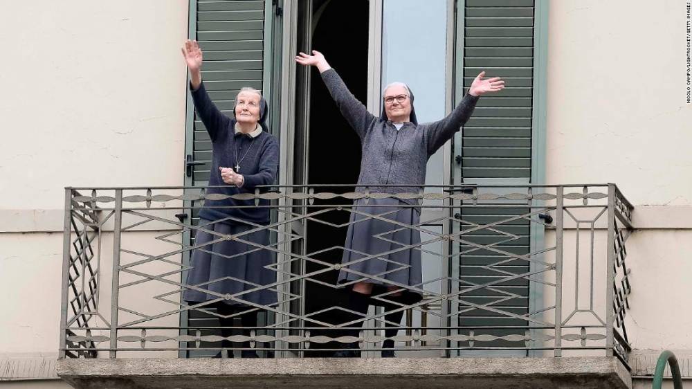Photos: The novel coronavirus outbreak Two nuns greet neighbors from their balcony in Turin, Italy, on Sunday, March 15.Hide Caption 14 of 140