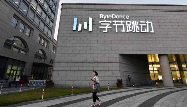 A woman walks past the headquarters of ByteDance, the Chinese parent company of video app TikTok.