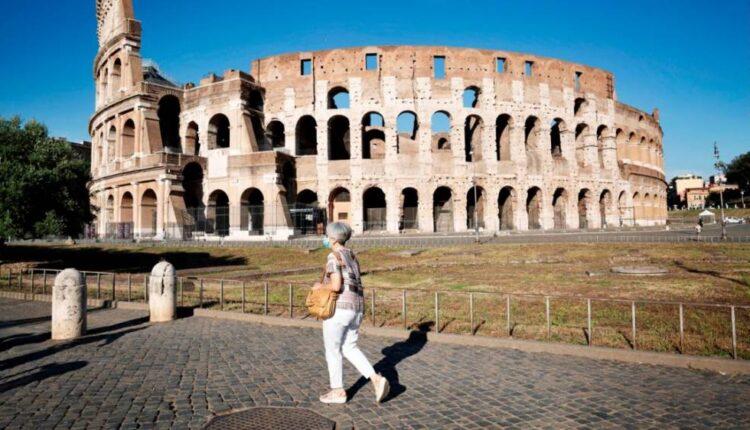 A woman walks in front of the Colosseum on July 10 in Rome, Italy.