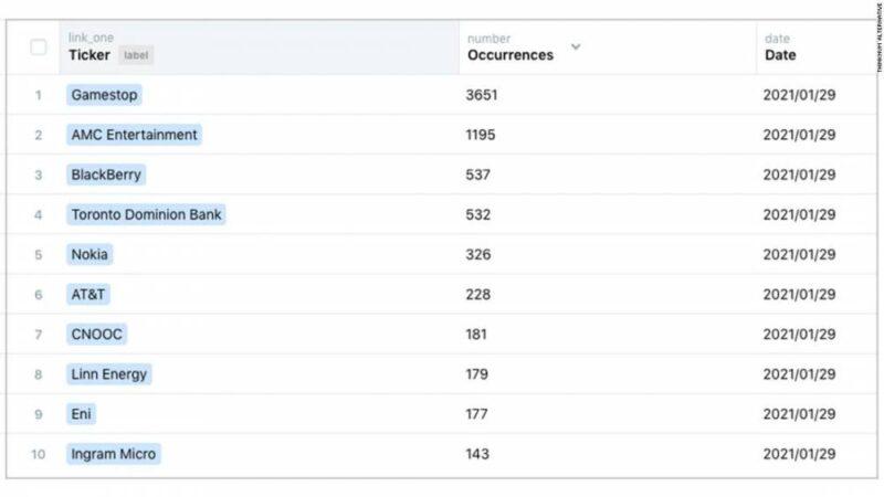 “The inbound inquiries from people asking about the dataset has been insane. I’ve never seen anything like it,” Justin Zhen, Thinknum’s co-founder and president, told CNN Business. Thinknum’s new offering shows how quickly Wall Street is adapting to this new phenomenon — ensuring it maintains control, even as traders on Reddit believe they’ve gained the upper hand on the establishment.Read MoreSome hedge funds that bet against GameStop (GME), AMC (AMC) and other stocks have been crushed by the Reddit-fueled rally. Those gains caused a massive short squeeze, where a stock climbed sharply, forcing those who bet against it to buy the stock back to avoid even greater losses. “Everyone is saying, ‘I need to track Reddit.’ It’s become one of the most important drivers of market movement,” Zhen said.As of Tuesday evening, the top mentioned stocks on Thinknum were GameStop, AMC and BlackBerry (BB).