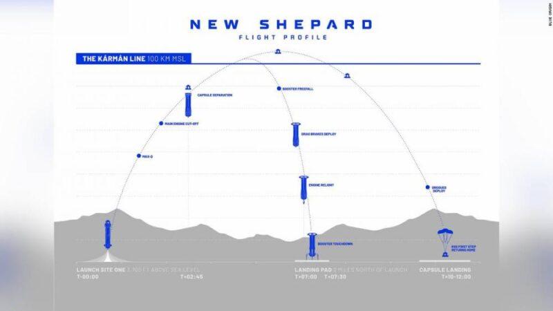 A graphic that shows the flight profile of Blue Origin’s New Shepard.The New Shepard capsule then deploys a large plume of parachutes to slow its descent to less than 20 miles per hour before it hits the ground, and Bezos and his fellow passengers will be further cushioned by shock-absorbent seats.