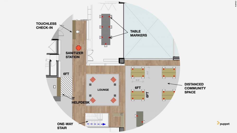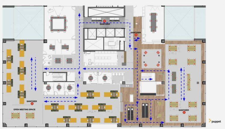 Tech company Puppet will add sanitizing stations to its office and look for ways to direct traffic.Desks are going to be moved so they are at least six feet apart and conference rooms are going to have to be reconfigured to create more space between participants.Expect to see subtle reminders throughout the office about social distance. Puppet, an IT automation company based in Portland, Oregon, is considering adding six-foot-long carpets behind workers’ desks to give other employees a visual cue for where they should stand to ask a question.