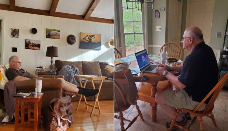 Dorie Griggs of Roswell, Georgia, snapped these photos of her husband, a photographer, who edits from home. “Stanley’s afternoon attire went upscale for a virtual meeting/dinner conference,” Griggs joked.After all, fashion in general has become increasingly casual over the past few decades. These days, activewear or “athleisure” is customary weekend wear, even outside the gym. Read MorePlus, formal work environments have become the exception, not the rule — a trend often blamed on millennials in tech startups. Even notoriously buttoned-up Goldman Sachs is adopting a more ‘flexible’ dress code. But even in a casual work environment, there’s a limit. When going to a job interview, 65% of Americans feel it’s important to wear a suit, regardless of how formal the company’s dress code is, according to a 2019 survey by Ranstad US.In the same survey, 50% of respondents say they wear business attire from the waist up and casual clothing from the waist down when they have a video interview.