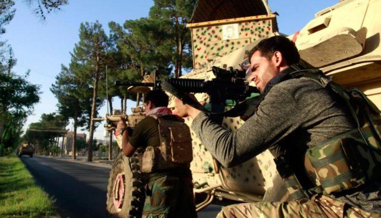 Afghan security personnel take a position during fighting between Taliban and Afghan security forces in Herat province, west of Kabul, Afghanistan, on August 3, 2021.