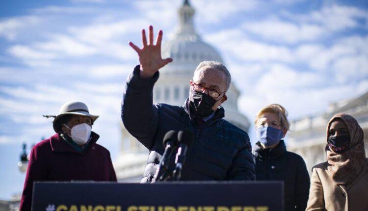 Senate Majority Leader Chuck Schumer, a Democrat from New York, speaks during a news conference on student loan debt in front of the U.S. Capitol in Washington, on Thursday, Feb. 4, 2021.Al Drago | Bloomberg | Getty Images
