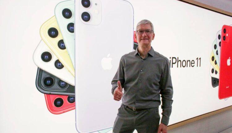 Apple CEO Tim Cook pose next to an image of the new iPhone 11.Kena Betancur | AFP | Getty Images