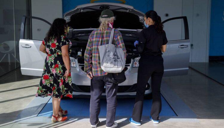 Customers inspect a Fiat Chrysler Automobiles NC Dodge Grand Caravan minivan at a Carvana Co. location in Westminster, California, U.S., on Thursday, May 28, 2020.Patrick T. Fallon | Bloomberg | Getty Images