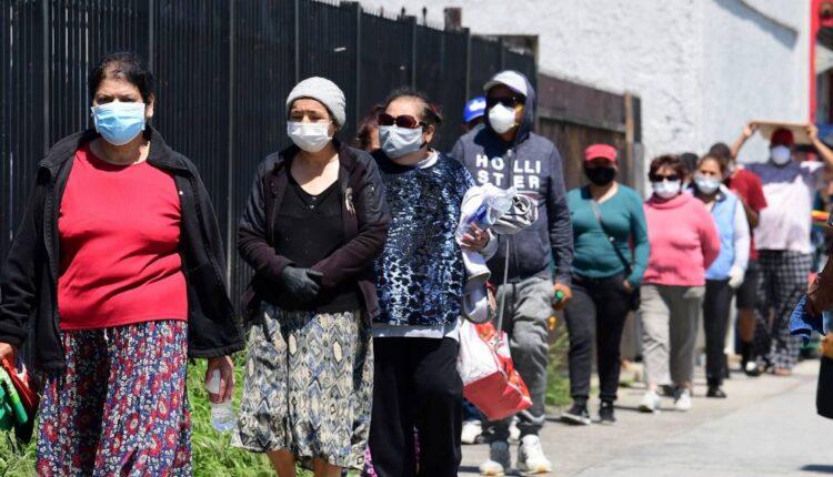 People wear their face masks waiting in line for an emergency food distribution at the 88th Street Temple Church of God in Christ on April 14, 2020 in Los Angeles, California, during the coronavirus pandemic.Frederic J. Brown | AFP | Getty Images