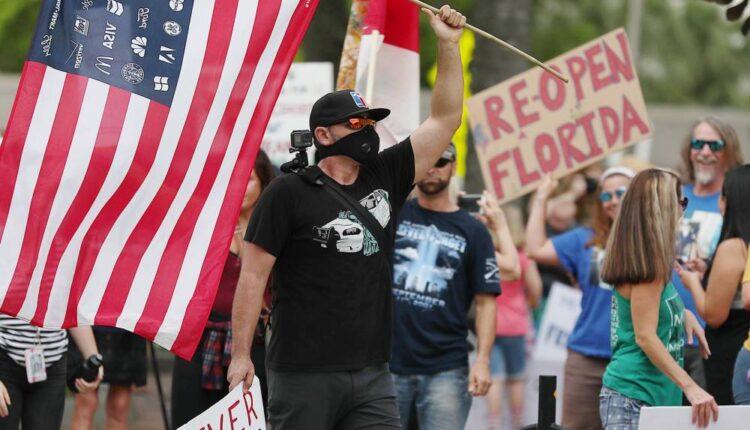 Protesters demanding Florida businesses and government reopen, march in downtown Orlando, Fla., Friday, April 17, 2020. Small-government groups, supporters of President Donald Trump, anti-vaccine advocates, gun rights backers and supporters of right-wing causes have united behind a deep suspicion of efforts to shut down daily life to slow the spread of the coronavirus.John Raoux | AP