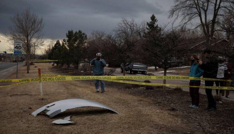 Residents take pictures of debris fallen from a United Airlines airplane's engine on the neighborhood of Broomfield, outside Denver, Colorado, on Feb. 20, 2021. A United Airlines flight suffered a fiery engine failure Feb. 20, shortly after taking off from Denver on its way to Hawaii, dropping massive debris on a residential area before a safe emergency landing, officials said.Chet Strange | AFP | Getty Images