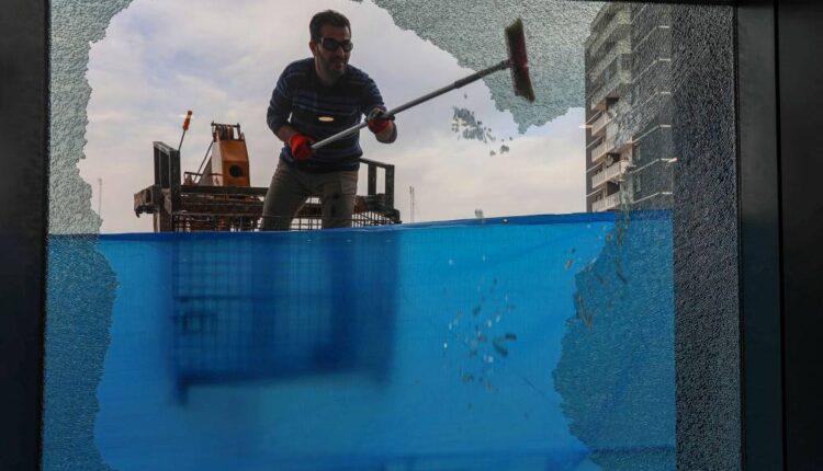 A worker cleans shattered glass on February 16, 2021 outside a damaged shop following a rocket attack the previous night in Arbil, the capital of the northern Iraqi Kurdish autonomous region.Safin Hamed | AFP | Getty Images