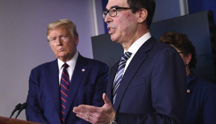 President Donald Trump and Treasury Secretary Steven Mnuchin (L) participate in a video conference with representatives of large banks and credit card companies about more financial assistance for small businesses in the Roosevelt Room at the White House April 07, 2020 in Washington, DC.Doug Mills | Getty Images