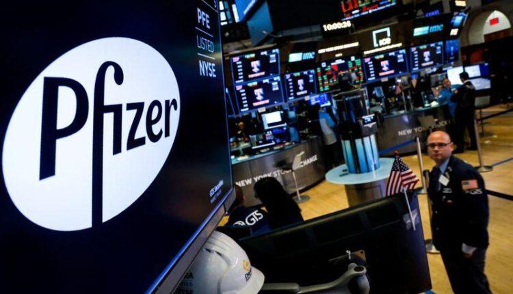 FILE PHOTO: A logo for Pfizer is displayed on a monitor on the floor at the New York Stock Exchange (NYSE) in New York, U.S., July 29, 2019. REUTERS/Brendan McDermid