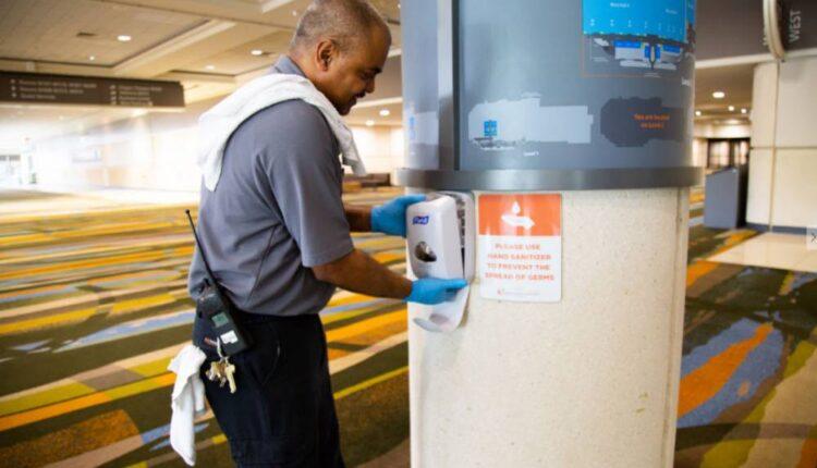 An Orange County Convention Center employee replaces a sanitizer station ahead of the center's reopening in July 2020.Source: Orange County Convention Center