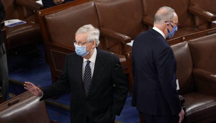 Senate Majority Leader Mitch McConnell (L) (R-KY) and Senate Minority Leader Chuck Schumer (R) (D-NY) stand back to back in the House Chamber during a joint session of Congress on January 06, 2021 in Washington, DC.Drew Angerer | Getty Images