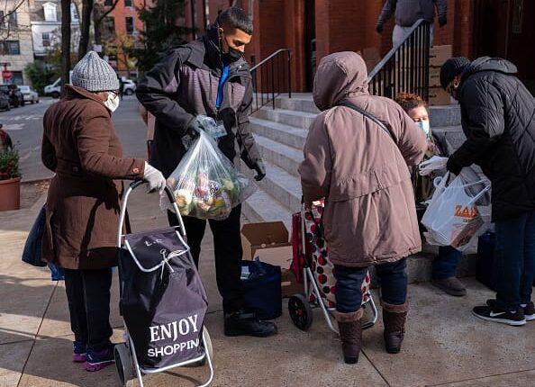 People line up to receive free food donations Nov. 19, 2020 outside the St. Charles Borromeo Church in New York City.Robert Nickelsberg | Getty Images News | Getty Images