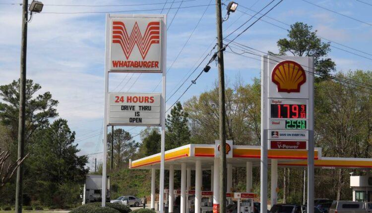 A Whataburger and Shell gas station sign shows coronavirus impacts on Alabaster, Alabama on March 22, 2020.Michael Wade | Icon Sportswire | Getty Images